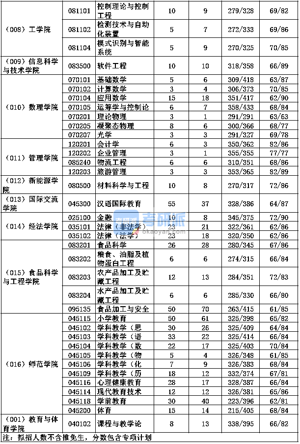 年份 學院 專業 報錄人數 錄取人數 報錄比 推免人數 2006 教育與體育學院 教育技術學 35 9 25.71% / 2006 數理學院 應用數學 66 18 27.27% / 2006 數理學院 理論物理 52 16 30.77% / 2006 文學院 中國古代文…… 日期:07-30 閱讀量:2186