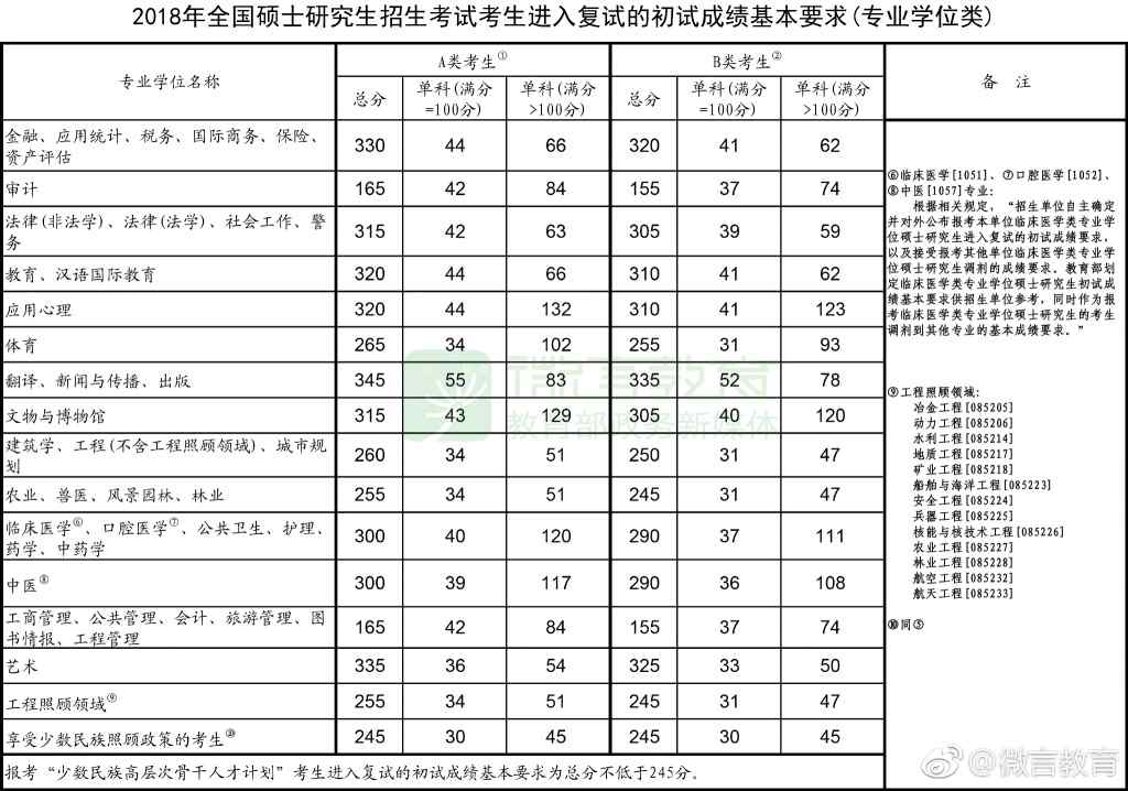 以2018年國家線為例,AB區(qū)分數(shù)線不一樣,看報考學校所在的是哪個區(qū)。至于滿分大于100分,指的是專業(yè)課和數(shù)學,都是150分的,單科一百分指的是英語和政治,如果都是40分,那就是超過40分才能過線。有時候英語和政治的分數(shù)線不一樣,第一個是政治的(如40),第二個是英語的(38),按照考試科目的順序的。總分又是另外的一條線了,不是把各科的分數(shù)線相加。就算單科每門都剛過分數(shù)線,總分達不到也是不行的。