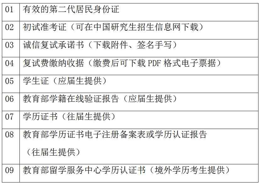 必要材料:身份證、學(xué)生證(應(yīng)屆生)、《教育部學(xué)籍在線驗(yàn)證報告》(應(yīng)屆生)、畢業(yè)證(往屆生)、《教育部學(xué)歷證書電子注冊備案表》(往屆生)、準(zhǔn)考證、復(fù)試費(fèi)繳款證明。