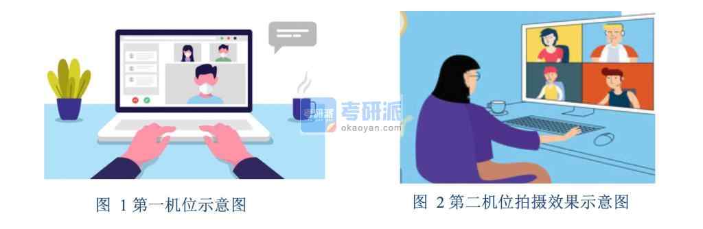 網絡遠程復試考生應按報考學院要求備妥軟硬件條件和網絡環境,提前安裝指定軟件(留意后續通知),并按報考學院要求配合完成網絡遠程復試軟件測試。考生需要準備可以支撐“雙機位”運行的硬件,即需要兩部帶攝像頭的設備及附件,包括筆記本電腦、手機、手機支架等,具體請根據各學科(專業)復試辦法準備。一臺設備(第一機位)從正面拍攝,放置在距離本人30cm處,另一臺設備(第二機位)從考生側后方45°距離本人30cm處拍攝,確保第一機位和第二機位分別從考生面前和身后完整拍攝到考生全身、復試組教師能夠從第二機位清晰看到第一機位屏幕。效果圖如下。
