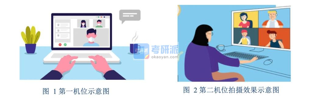 網絡遠程復試考生應按報考學院要求備妥軟硬件條件和網絡環(huán)境,提前安裝指定軟件,并按報考學院要求配合完成網絡遠程復試軟件測試。考生需要準備可以支撐“雙機位”運行的硬件,即需要兩部帶攝像頭的設備及附件,包括筆記本電腦、手機、手機支架等,具體請根據各學院復試辦法準備。一臺設備(第一機位)從正面拍攝,放置在距離本人30cm處,另一臺設備(第二機位)從考生側后方45°距離本人30cm處拍攝,確保第一機位和第二機位分別從考生面前和身后完整拍攝到考生全身、復試組教師能夠從第二機位清晰看到第一機位屏幕。效果圖如下。