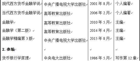 出版有個人專著《經濟發展中的金融中介》,主編教材《信托與融資租賃》、《金融市場、工具與金融機構》、《商業銀行業務與經營》、《現代商業銀行業務教程》,參編教材《金融中介學》,參與編著《20世紀西方貨幣金融理論研究:進展與評述》,曾先后在《財貿經濟》、《財政研究》等雜志上發表論文數十篇。參加了“21世紀中國金融學專業教育教學改革與發展戰略研究”、“中國經濟發展階段演進與金融發展的總量及結構分析”等教育部重大課題研究。