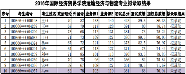 2016年對外經濟貿易大學運輸經濟與物流考研擬錄取結果