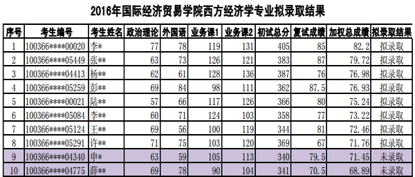 2016年對外經濟貿易大學西方經濟學專業考研擬錄取結果