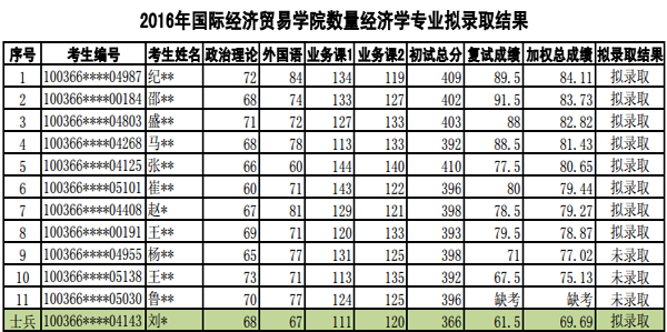 2016年對外經(jīng)濟貿(mào)易大學數(shù)量經(jīng)濟學考研擬錄取結(jié)果