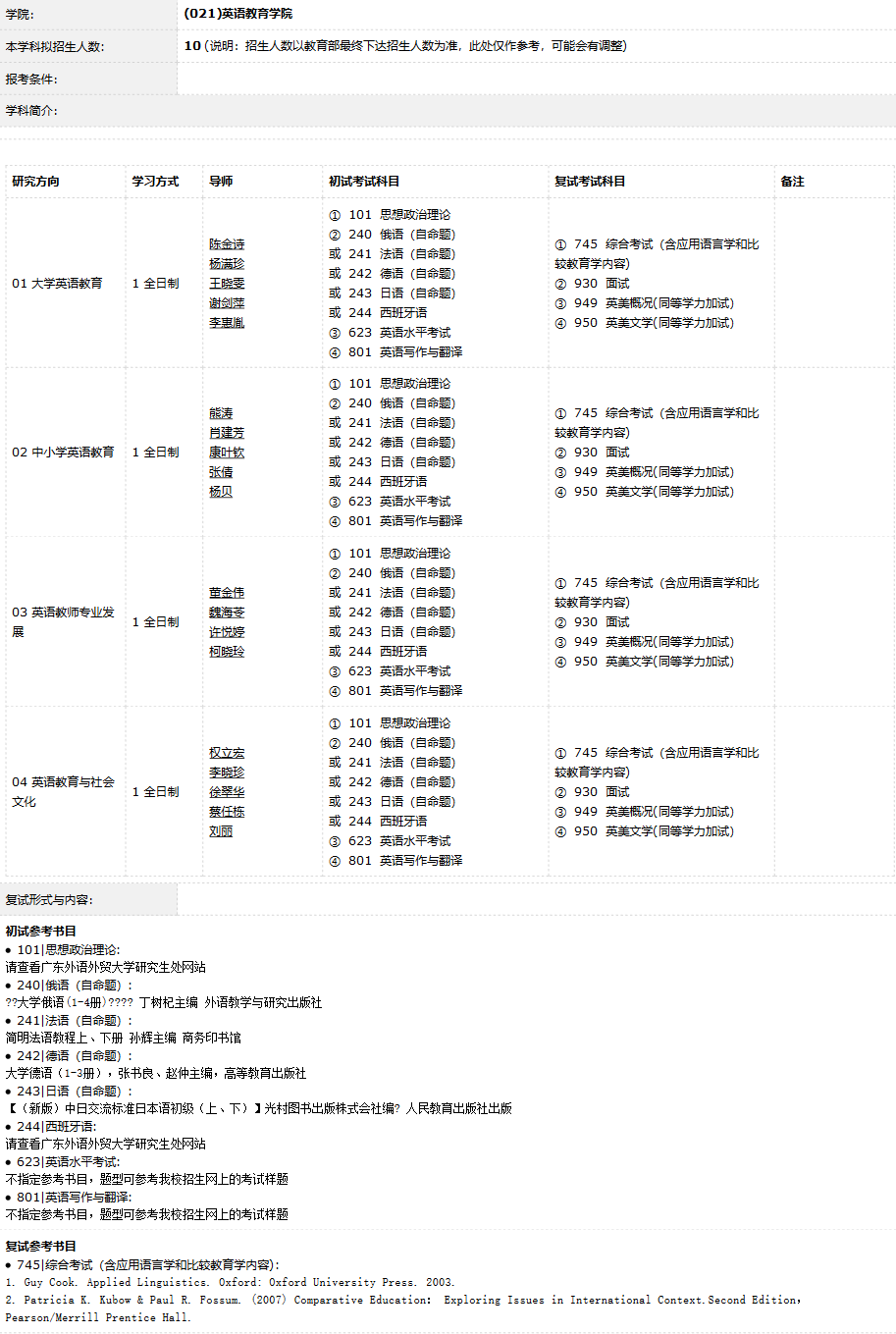 | 研究方向: | 01 (全日制)大學英語教育 02 (全日制)中小學英語教育 03 (全日制)英語教師專業(yè)發(fā)展 04 (全日制)英語教育與社會文化 |