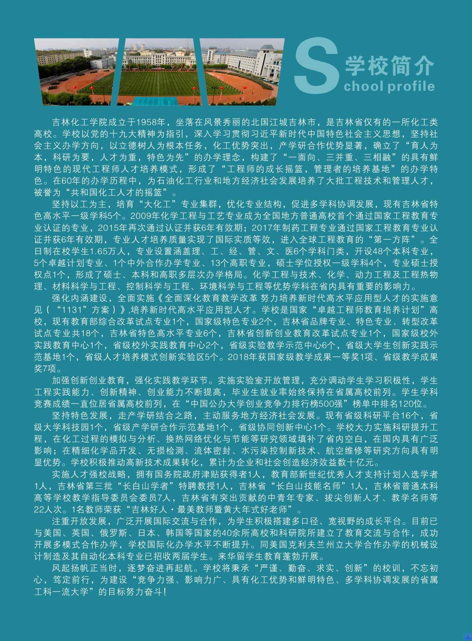 學校地處風光秀麗的霧淞冰雪名城、中國魅力城市——吉林市。現有兩個校區,占地面積108.9萬平方米,設有研究生學院、14個教學院(部)和1個工程訓練中心、1個分析測試中心,專業設置涵蓋工、理、經、管、文、醫6個學科門類,碩士、本科和高職多層次辦學,全日制在校學生1.5萬余人。學校獲得教育部本科教學工作水平評估優秀成績;化學工程與工藝專業是吉林省首家、全國地方工科院校中第一個通過教育部工程教育專業認證的專業;2011年,學校成為教育部第二批“卓越工程師教育培養計劃”高校。學校目前在化學工程與技術、化學、動力工程及工程熱物理3個一級學科(含13個二級學科)招收學術型碩士研究生,在控制工程專業招收全日制專業型碩士(工程碩士)研究生。
