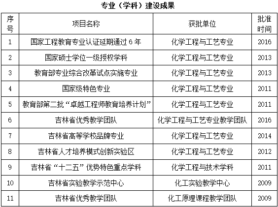 我校1958年設立的有機化工專業、無機化工專業和1978年以后增設的化學工程專業、石油加工專業發展而來,1998年國家專業調整合并為化學工程與工藝專業。化學工程與工藝專業是國家級特色專業,是吉林省首家和全國地方工科院校中第一個通過教育部工程教育化學工程與工藝專業認證的專業,2011年被列入教育部第二批“卓越工程師教育培養計劃”(各項榮譽、成績及平臺見下表)。