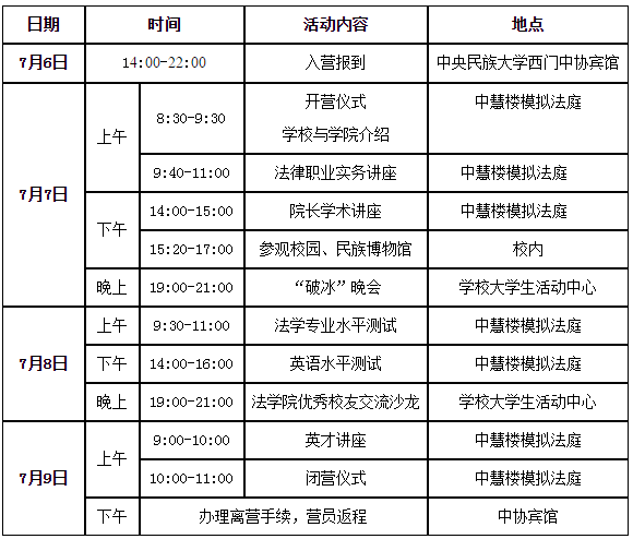 根據(jù)綜合考核成績,將給予部分營員2019年中央民族大學法學碩士(經(jīng)濟法、憲法學與行政法、民族法學、法律史、法理學、民商法、訴訟法、刑法、國際法)研究生推薦免試接收候選人資格,共計約10名;法律碩士(法學)10名。