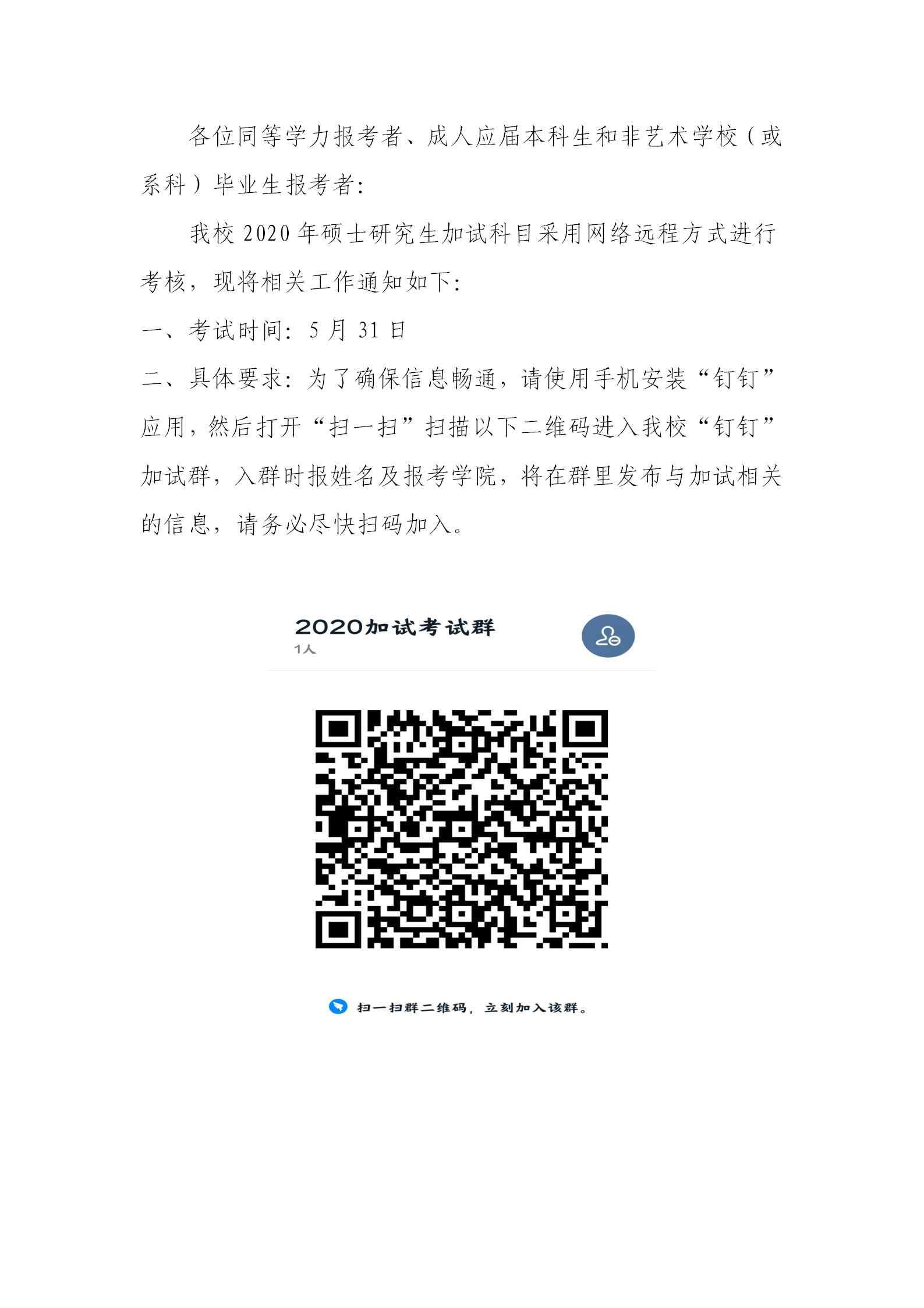 加試科目采用網絡遠程方式進行考核,具體通知將于我校研究生處網站發布十一、體檢在疫情防控期間,為了保障考生的生命健康安全,避免考生到醫院、體檢中心等人員密集高危險地點聚集,我校2020年碩士研究生招生考試體檢與新生入學體檢合并。