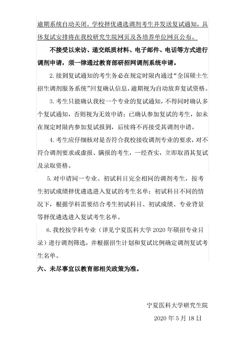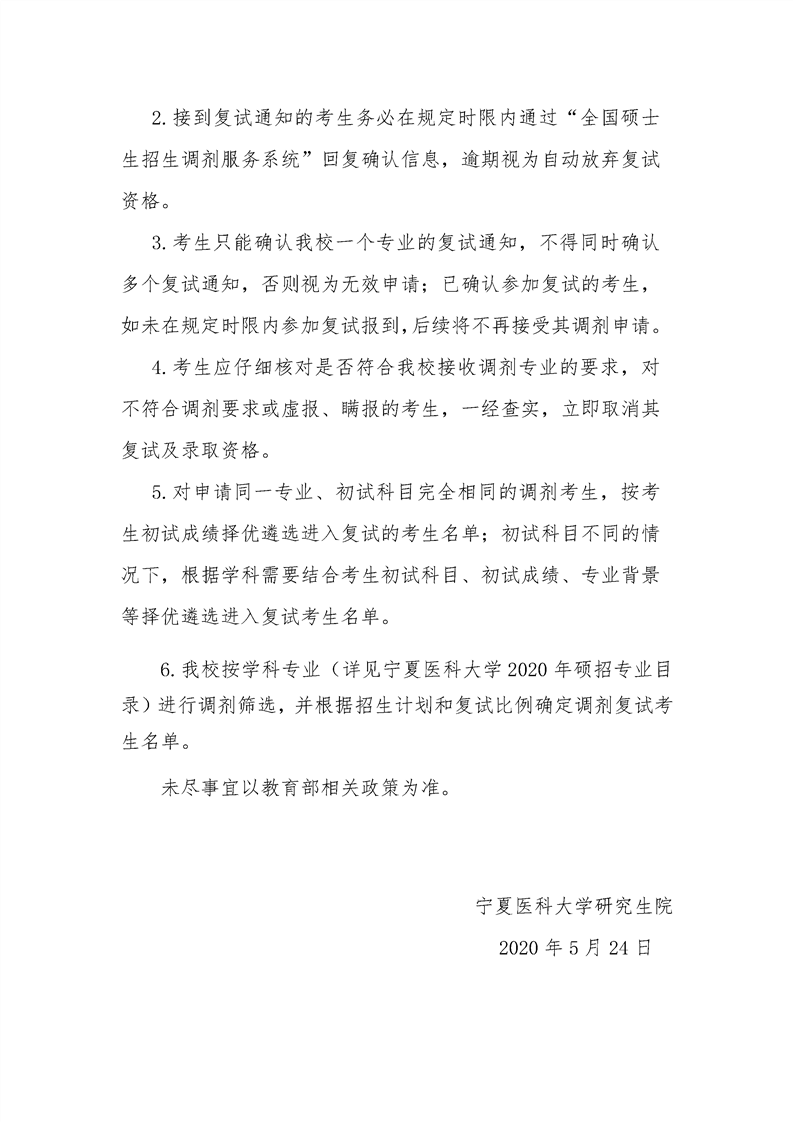 2020年寧夏醫科大學碩士研究生調劑復試通知