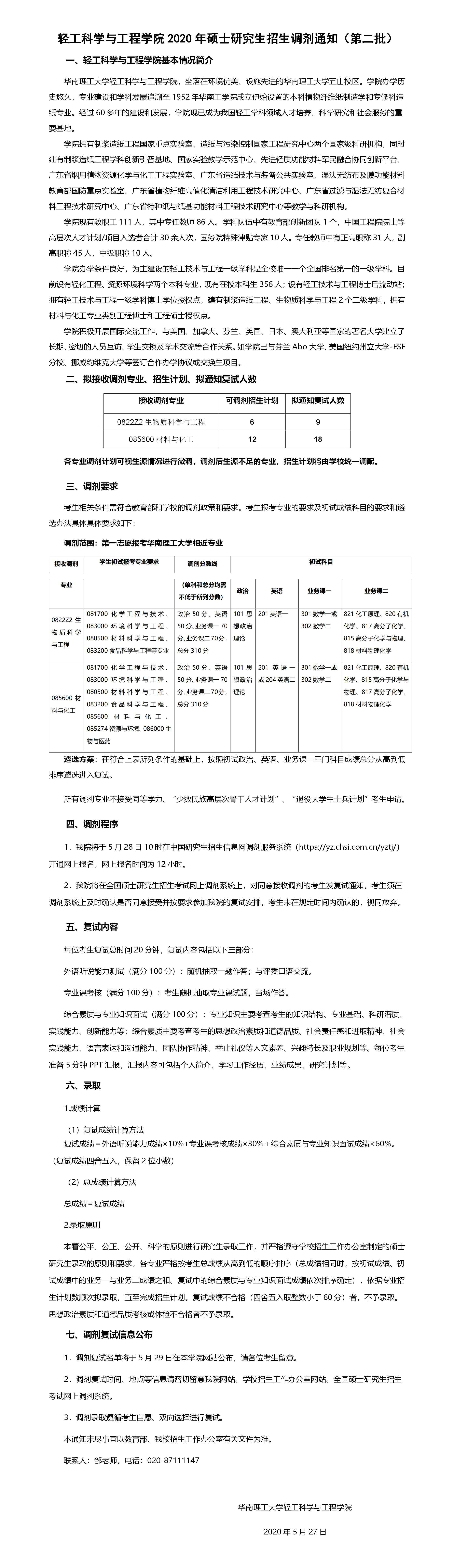 2020年華南理工大學輕工科學與工程學院碩士研究生調劑通知