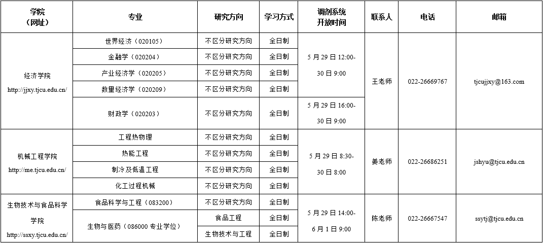 我校經濟學院、機械工程學院、生物技術與食品科學學院部分專業仍有調劑名額,接受考生調劑報名申請。有意愿調劑我校的考生,在“全國碩士生招生調劑服務系統”填報調劑志愿申請,如有疑問請咨詢相關學院。我校將盡快對申請考生進行調劑資格審核,并通知參加復試。接收調劑的專業、調劑系統開放時間及聯系方式