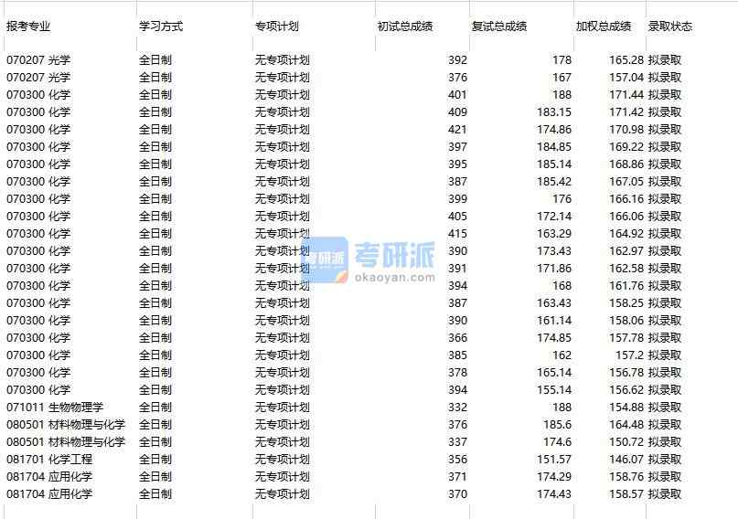 | 06結構化學 | 全日制 | ①101思想政治理論;②201英語一;③721物理化學(含結構化學);④837有機化學(或)838無機化學和分析化學 | ||