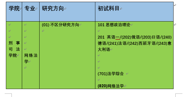 | 考試科目: | ①101思想政治理論 ②外國語(七選一,詳見目錄說明) ③701法學綜合 ④820網絡法學 |