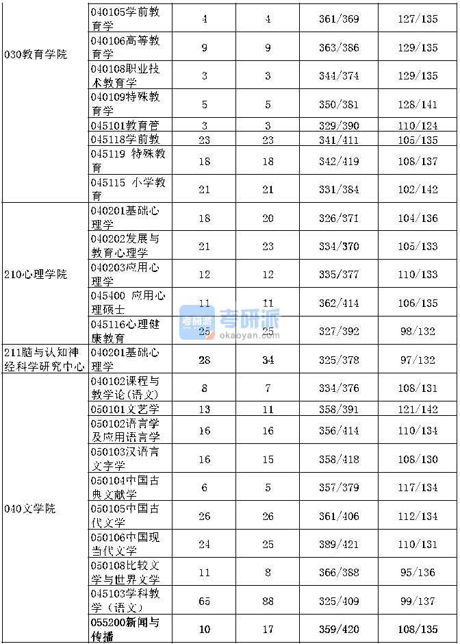 年份 地區(qū) 學(xué)校 學(xué)院 專業(yè)代碼 專業(yè)名稱 報名人數(shù) 錄取人數(shù) 報錄比 推免人數(shù) 2017 遼寧 遼寧師范大學(xué) 心理學(xué)院 040201 基礎(chǔ)心理學(xué) / 18 / / 2017 遼寧 遼寧師范大學(xué) 腦與認知神經(jīng)科學(xué)研究中心…… 日期:08-09 閱讀量:2178