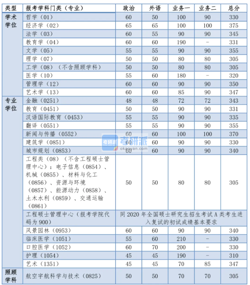 同 2021 年全國碩士研究生招生考試 A 類考生進 入復試的初試成績基本要求 |