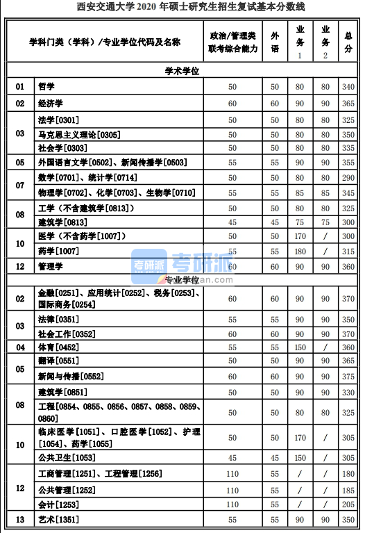 西安交通大學 2020 年各學院(部、中心)碩士研究生招生復試分數線