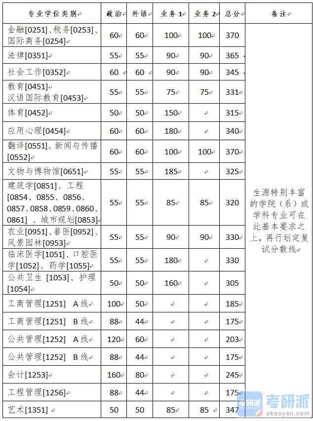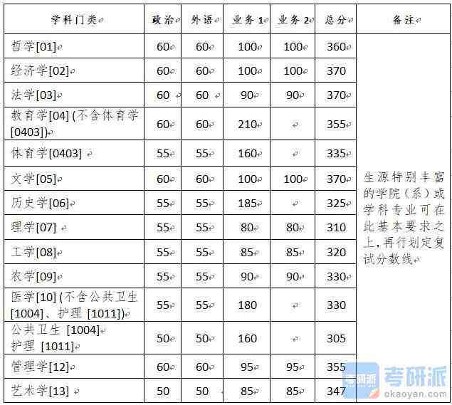 | 哲學[01] | 55 | 55 | 95 | 95 | 340 | 生源特別豐富的院系或學科專業可在此基本要求之上,再行劃定復試分數線。 |