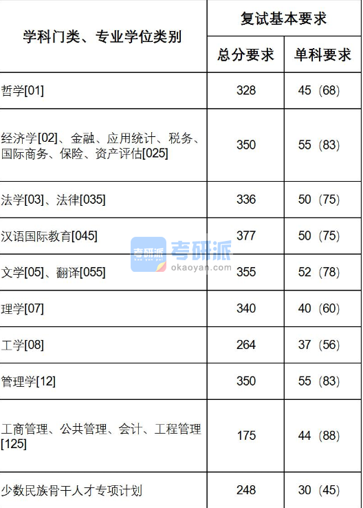 | 少數民族骨干人才專項計劃、退役大學生士兵專項計劃 | 260/156 | 40(60/90) | 滿分為300分的專業總分須達到156分。其中退役大學生士兵專項計劃進入復試的基本要求為總分達到345分(滿分300分的專業總分須達到207分),如參加復試考生放棄復試或擬錄取資格,或復試后未被錄取,將根據初試總分由高到低順序依次遞補后續考生進入復試 |