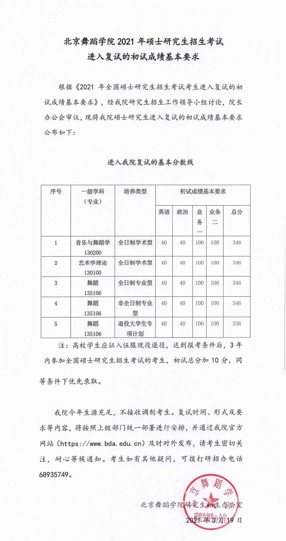 2021北京舞蹈學院考研分數線(研究生復試分數線)
