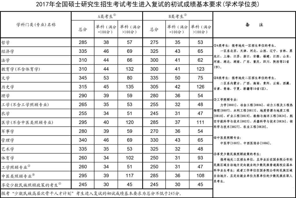 | 哲學(xué) | 300 | 42 | 63 | 290 | 39 | 59 | ①A類考生:報(bào)考地處一區(qū)招生單位的考生。一區(qū)系北京、天津、河北、山西、遼寧、吉林、黑龍江、上海、江蘇、浙江、安徽、福建、江西、山東、河南、湖北、湖南、廣東、重慶、四川、陜西等21省(市)。②B類考生:報(bào)考地處二區(qū)招生單位的考生。二區(qū)系內(nèi)蒙古、廣西、海南、貴州、云南、西藏、甘肅、青海、寧夏、新疆等10省(區(qū))。③工學(xué)照顧專業(yè):力學(xué)[0801]、冶金工程[0806]、動(dòng)力工程及工程熱物理[0807]、水利工程[0815]、地質(zhì)資源與地質(zhì)工程[0818]、礦業(yè)工程[0819]、船舶與海洋工程[0824]、航空宇航科學(xué)與技術(shù)[0825]、兵器科學(xué)與技術(shù)[0826]、核科學(xué)與技術(shù)[0827]、農(nóng)業(yè)工程[0828]。④中醫(yī)類照顧專業(yè):中醫(yī)學(xué)[1005]、中西醫(yī)結(jié)合[1006]。⑤享受少數(shù)民族照顧政策的考生:報(bào)考地處二區(qū)招生單位,且畢業(yè)后在國(guó)務(wù)院公布的民族區(qū)域自治地方定向就業(yè)的少數(shù)民族普通高校應(yīng)屆本科畢業(yè)生考生;或者工作單位和戶籍在國(guó)務(wù)院公布的民族區(qū)域自治地方,且定向就業(yè)單位為原單位的少數(shù)民族在職人員考生。 |