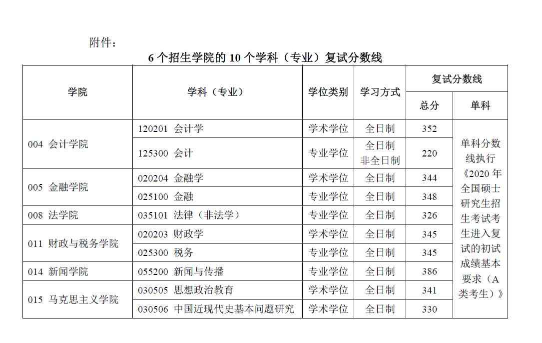 1. 6個招生學院的10個學科(專業)考生進入復試的初試成績須達到我校劃定的復試分數線要求(見附件);其余學科(專業)考生進入復試的初試成績須達到《2020年全國碩士研究生招生考試考生進入復試的初試成績基本要求(A類考生)》(以下簡稱國家分數線)。