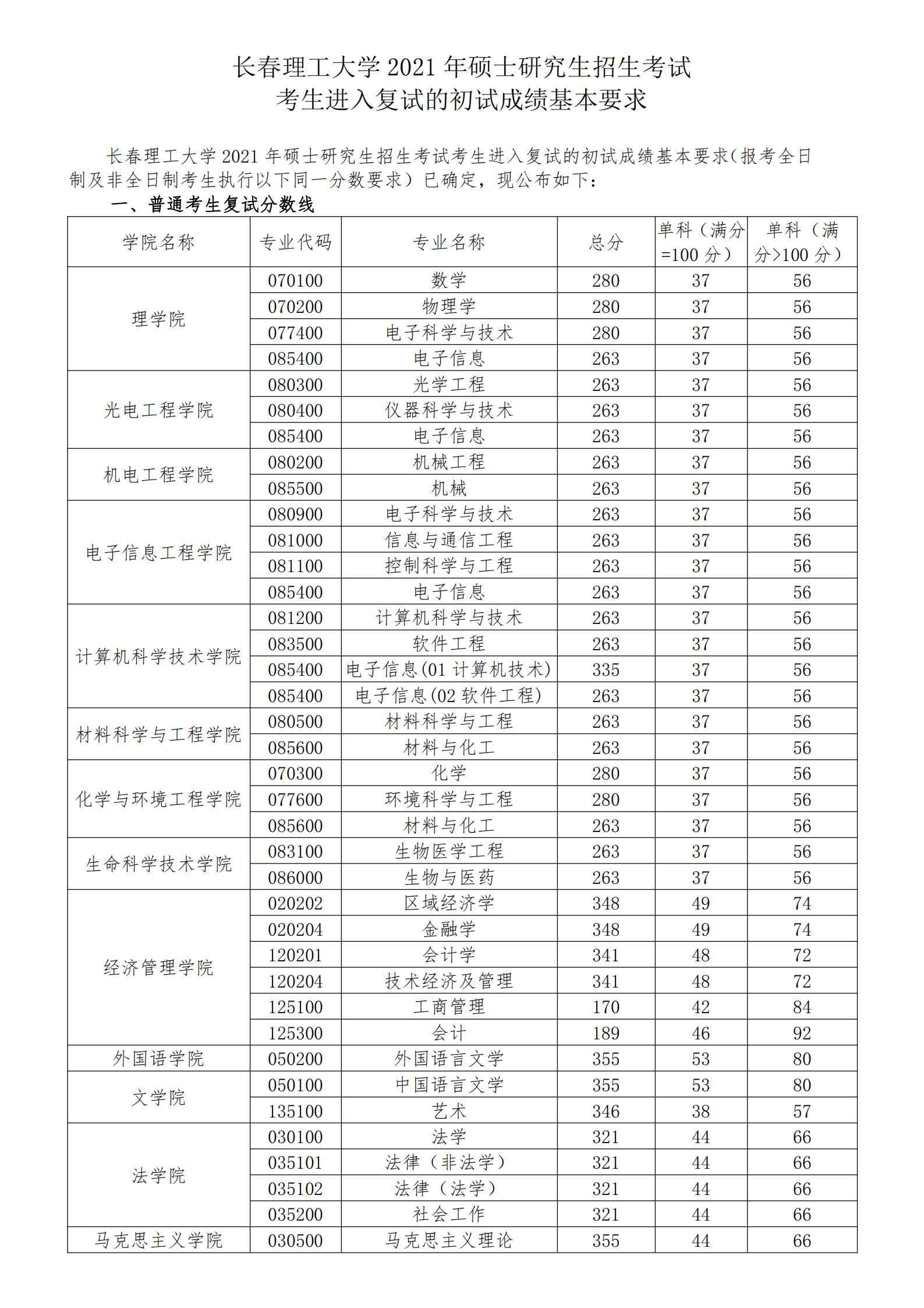 2021長春理工大學考研分數線(研究生復試分數線)