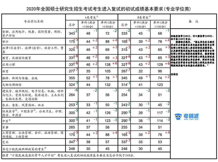 2020考研國家線如下:表格中變動是與2019年國家線對比