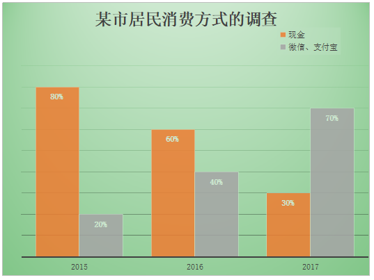 From the bar chart given above, we can observe that the way of payment in a certain city of China has experienced a dramatic change in the 3 years from 2015 to 2017. The share of way of payment in cash declined dramatically from 80% in 2015 to 30% in 2017, while taking a look at the statistics of that in wechat and Alipay , we can see that it ascended gradually from 20% in 2015 to the maximum at 70% in 2017.